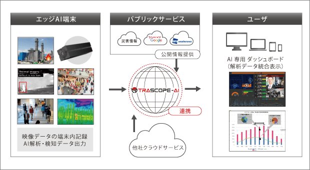 TRASCOPE-AIは、クラウド型のためエッジでの単一解析だけではなく、他社のAIサービスやパブリックな公開情報と連携した複合的な解析を行うことが可能です。これらの解析結果は、ダッシュボードへ統合表示されます。