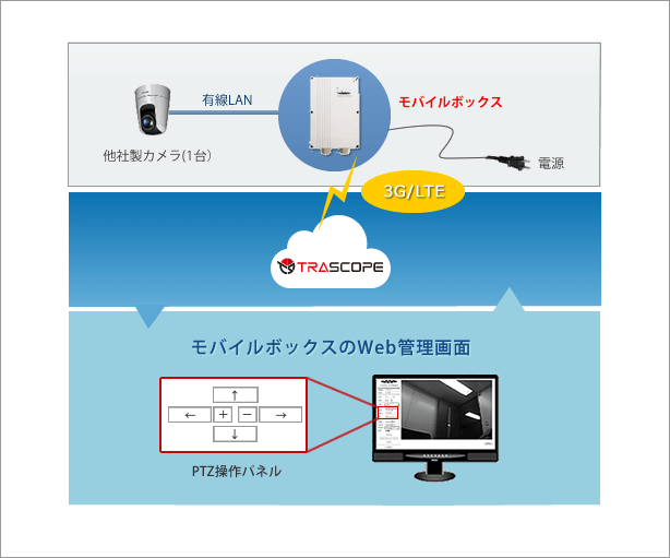 PTZ機能、暗視機能が必要な場合や、既存のネットワークカメラを活用したい場合は、モバイルボックス(SMB0500)と他社製ネットワークカメラ(※)とを接続することで、TRASCOPEのクラウドサービスをご利用いただけます。
