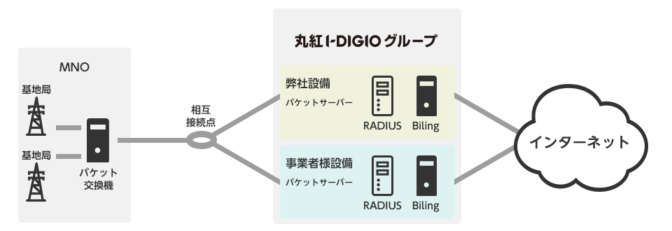 - 丸紅I-DIGIOグループが提供するコアネットワーク(閉域網)とお客様拠点を閉域接続用ネットワークで接続することで、端末(SIM)とお客様拠点のセキュアな通信を実現するサービスです。