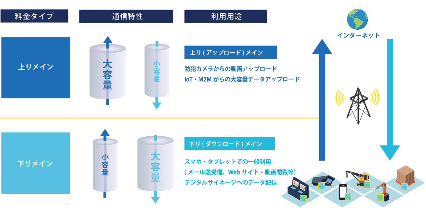 当社では、お客様の利用用途(通信特性)に応じて「上りメインプラン」、「下りメインプラン」2つの料金タイプを用意しております。