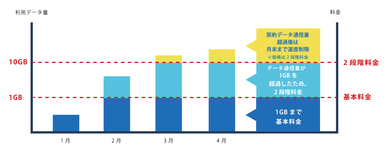 お客様のご要件・ご利用用途に応じて、1段階目の料金・パケット量、従量部分の料金、2段階目の料金を決定する事が可能です。