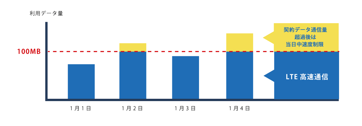 ※契約データ通信量を日中で超過した場合は、翌日まで通信速度が制限されます。