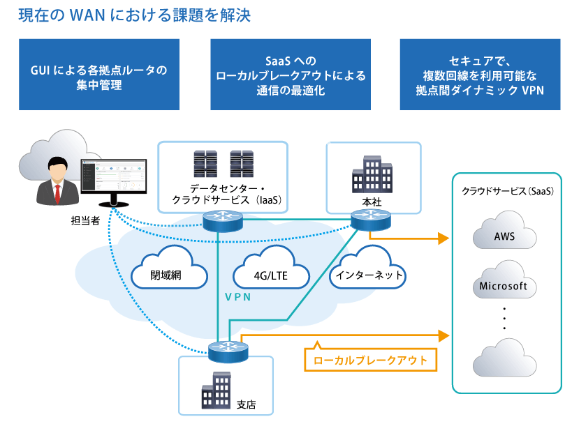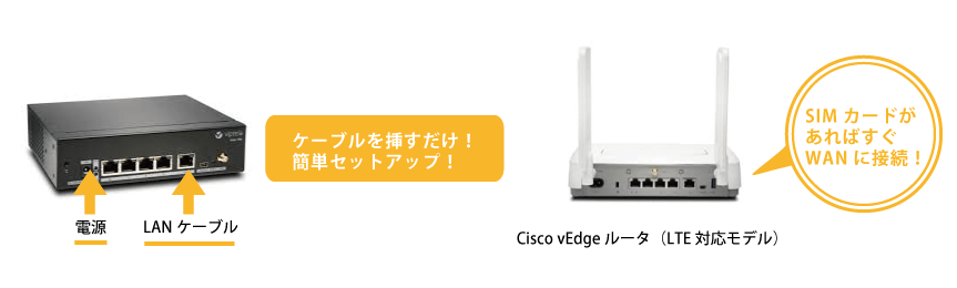 Cisco vEdge ルータのLTE対応モデルは、SIMカードを購入すればWANに接続が可能となり、担当者は各拠点に赴くことなく、機器の設定、プロビジョニングを実施することができます。