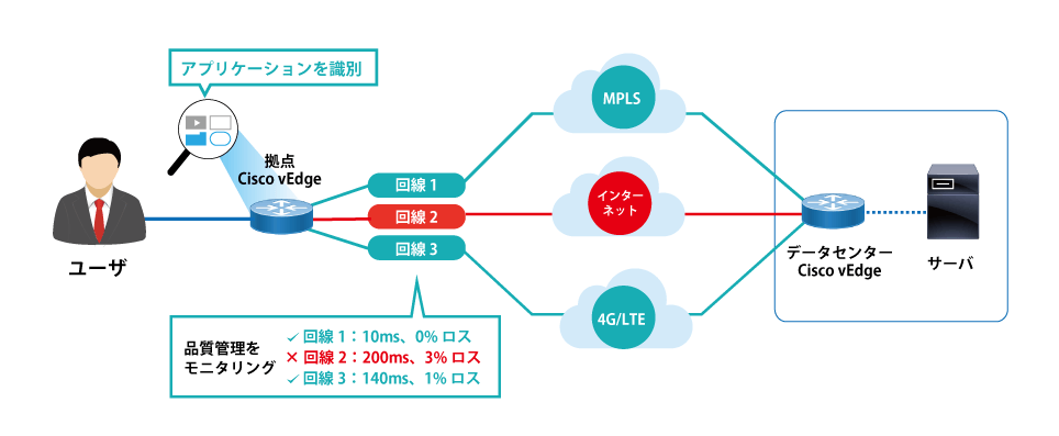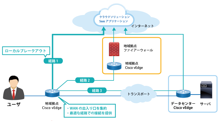 インターネット上の各種サービスやパブリッククラウドのご利用時にアプリケーションを特定し、最適な(リー ジョナルな)場所からインターネットへのダイレクト接続をご提供いたします。特定のアプリケーション通信のみ、センターを経由せずローカルブレークアウトさせたり、地理的に近い回線を利用させることが可能です。