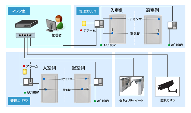 建物内にサーバを設置し、全フロアの全扉、セキュリティゲートを管理するすることが可能です。