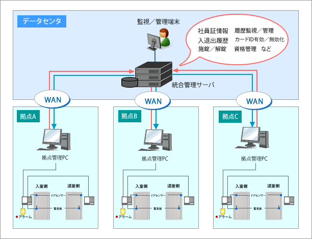 データセンターに設置した統合管理サーバーと拠点管理PCを同期させ、社員証情報や入退出履歴等のデータを管理します。各拠点ごとにスケジュールやポリシーを設定できます。
