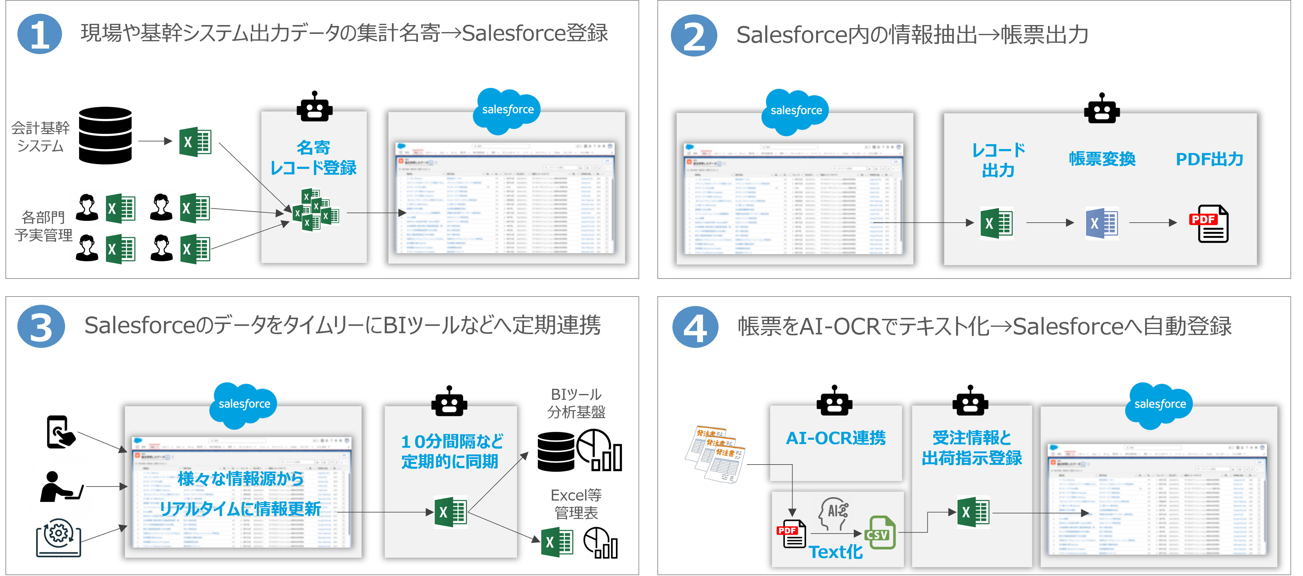 現場で簡単に自動化設定。プログラム言語知識ゼロでOK。Salesforceとはシステム連携、自由自在に安定した自動化を実現。