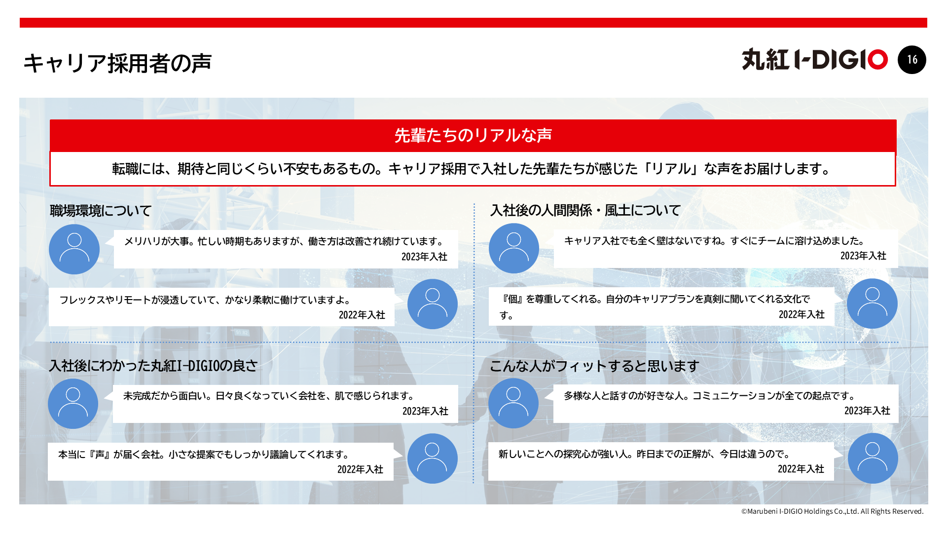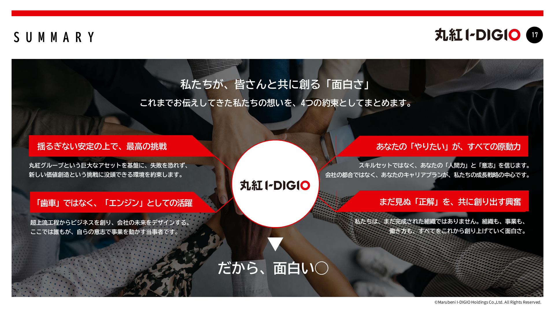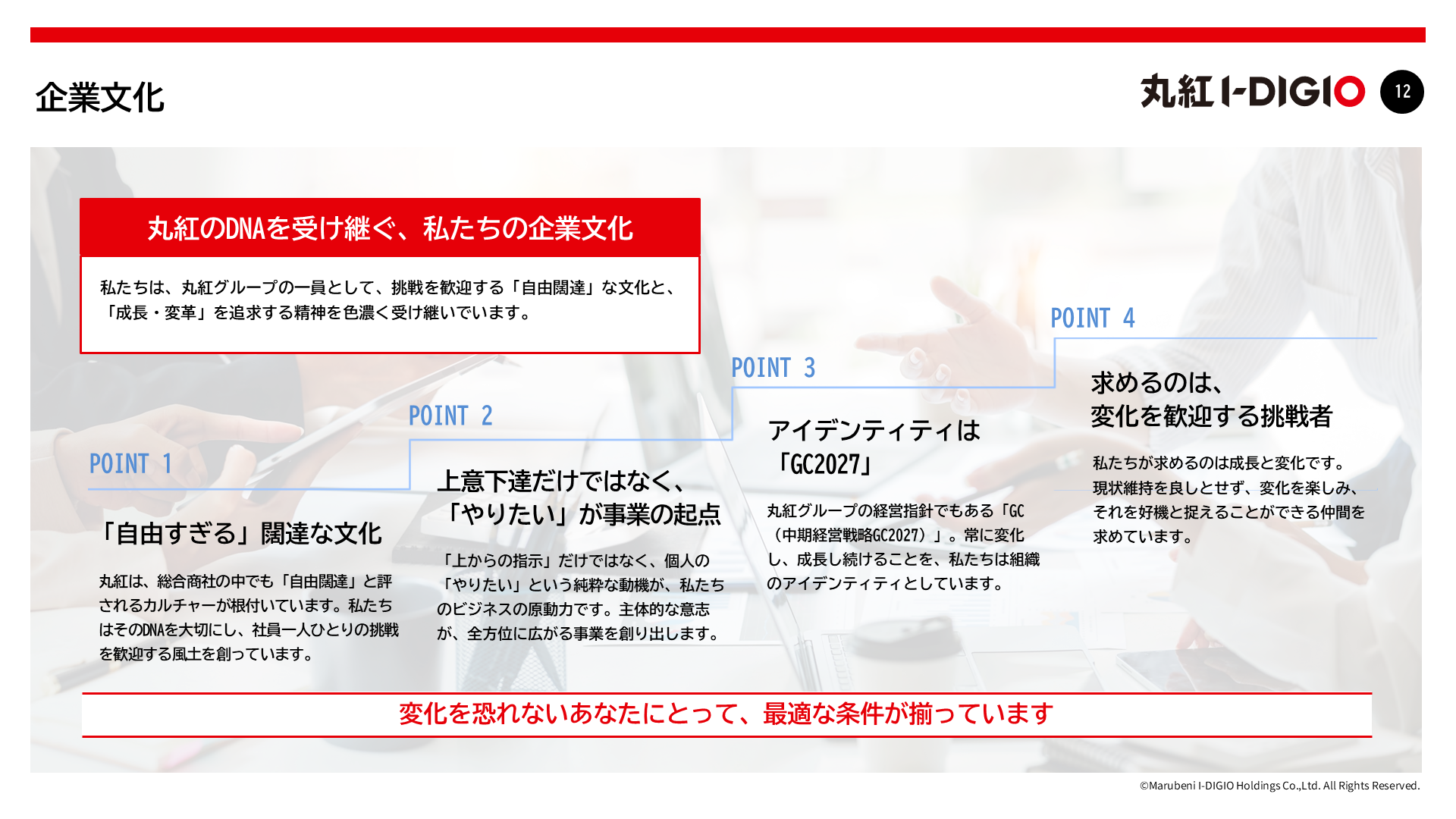 「やりたい」という個の意志を何よりも尊重する、自由闊達な文化。それが私たちのDNAです。丸紅グループの揺るぎない安定基盤があるからこそ、失敗を恐れずに挑戦し続けられます。上意下達だけではなく、一人ひとりがオーナーシップを持ち、自らの意志と裁量でビジネスを推進するプロフェッショナルな集団として、その挑戦の中から新しい価値を生み出していきます。