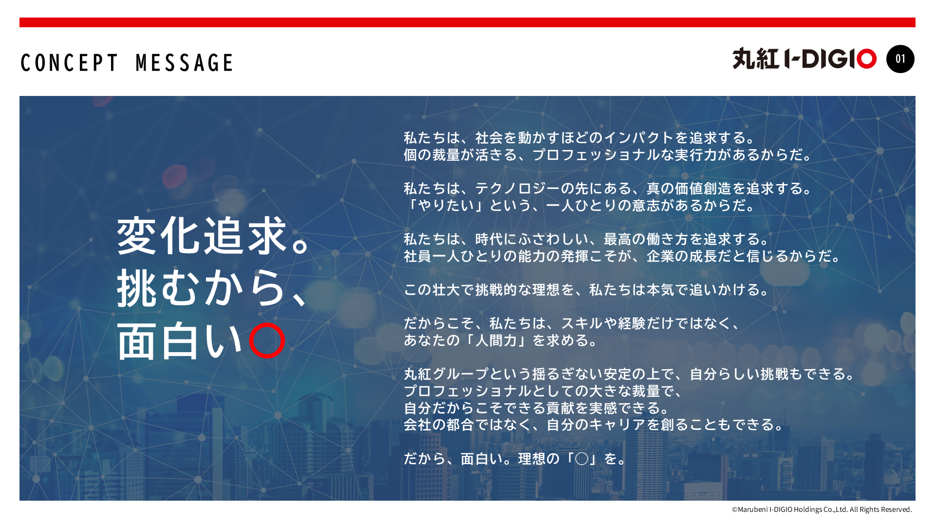 私たちは、総合商社・丸紅の強固な事業基盤と、ITの最先端技術を掛け合わせ、社会全体のデジタルトランスフォーメーション(DX)を加速させるために生まれた、挑戦者のための企業グループです。