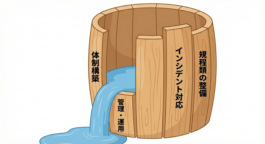 セキュリティ対策を考える上で重要なのが「セキュリティ桶(おけ)の理論」です。桶に入った水の量は、一番短い板の高さで決まります。同様に、どんなに高価なファイアウォールを入れていても、職員の端末管理が甘かったり、バックアップが不完全だったりすれば、攻撃者はその「一番低い板(脆弱性)」を見つけ出し、そこから侵入します。