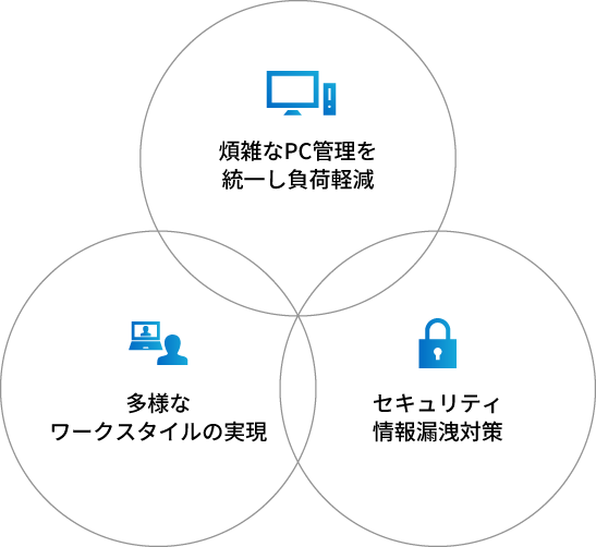 業務を仮想デスクトップに集約することで物理PCにデータをダウンロード/保管せずにPC紛失や悪意ある攻撃からの情報漏洩のリスクを低減できます。